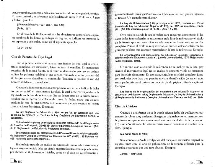 F) Mantener las expresiones en otros idiomas que no tienen traduccion exacta. Cuando se hace una cita textual se realiza tambien una cita a pie de pagina que indique la fuente. La cita va incerta en el cuerpo del trabajo de las siguientes formas: a) Continuada dentro del texto (si es menor de 5 lineas): a doble espacio, encerrada entre comillas, b) seguida del numero de llamada a medio espacio vertical o a continuacion de las comillas, c) encerrado entre parentesis. En ocasiones el numero de llamada podra situarse despues ) del nombre del autor o de la obra si ellos estan mencionados en el cuerpo del trabajo. B) Separada del texto (si es igual o mayor de 5 lineas): Sangrada a 10 espacios del margen izquierdo, i) Notas textuales que contienen comillas dobles: Si dentro de la nota existen comillas dobles, estas se ii) cambian por comillas simples, j) Notas textuales con letras cursivas: Si nuestro trabajo es macanografiado se deberan subrayar. – Notas mixtas y cruzadas: a) Las notas mixtas incluyen dos tipos de notas diferentes, por ejemplo textuales y comentario, o b) parafrasis y comentario. ) Las notas cruzadas o de contrarreferencia mencionan obras de otros autores que tambien escriben d) sobre ia misma materia.